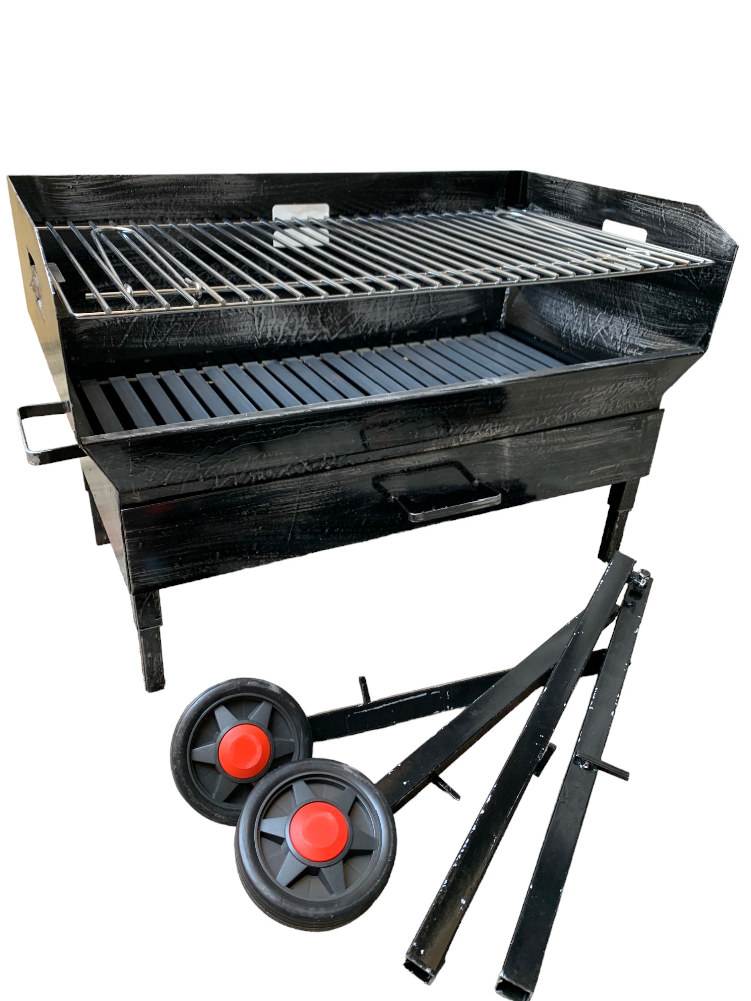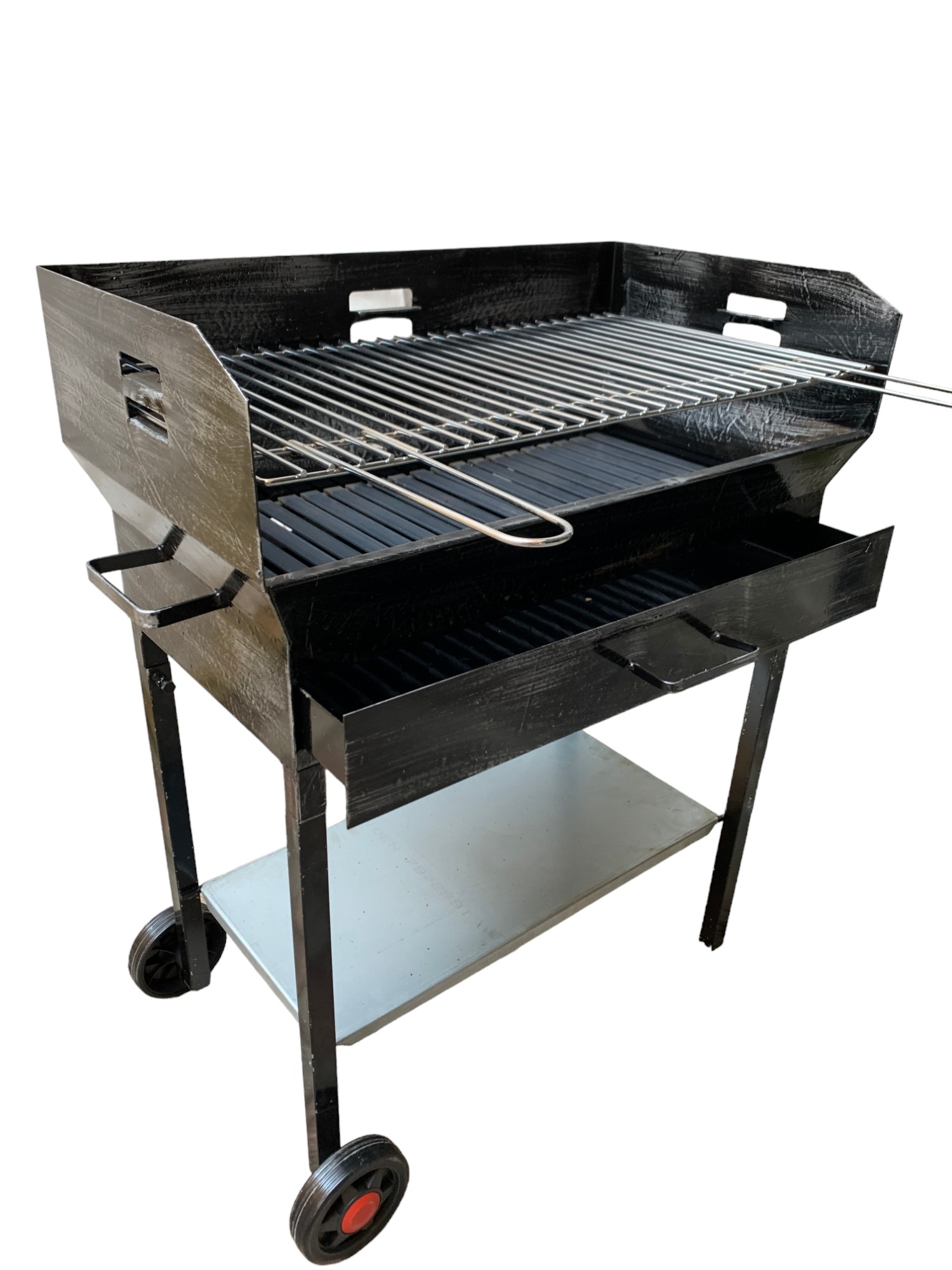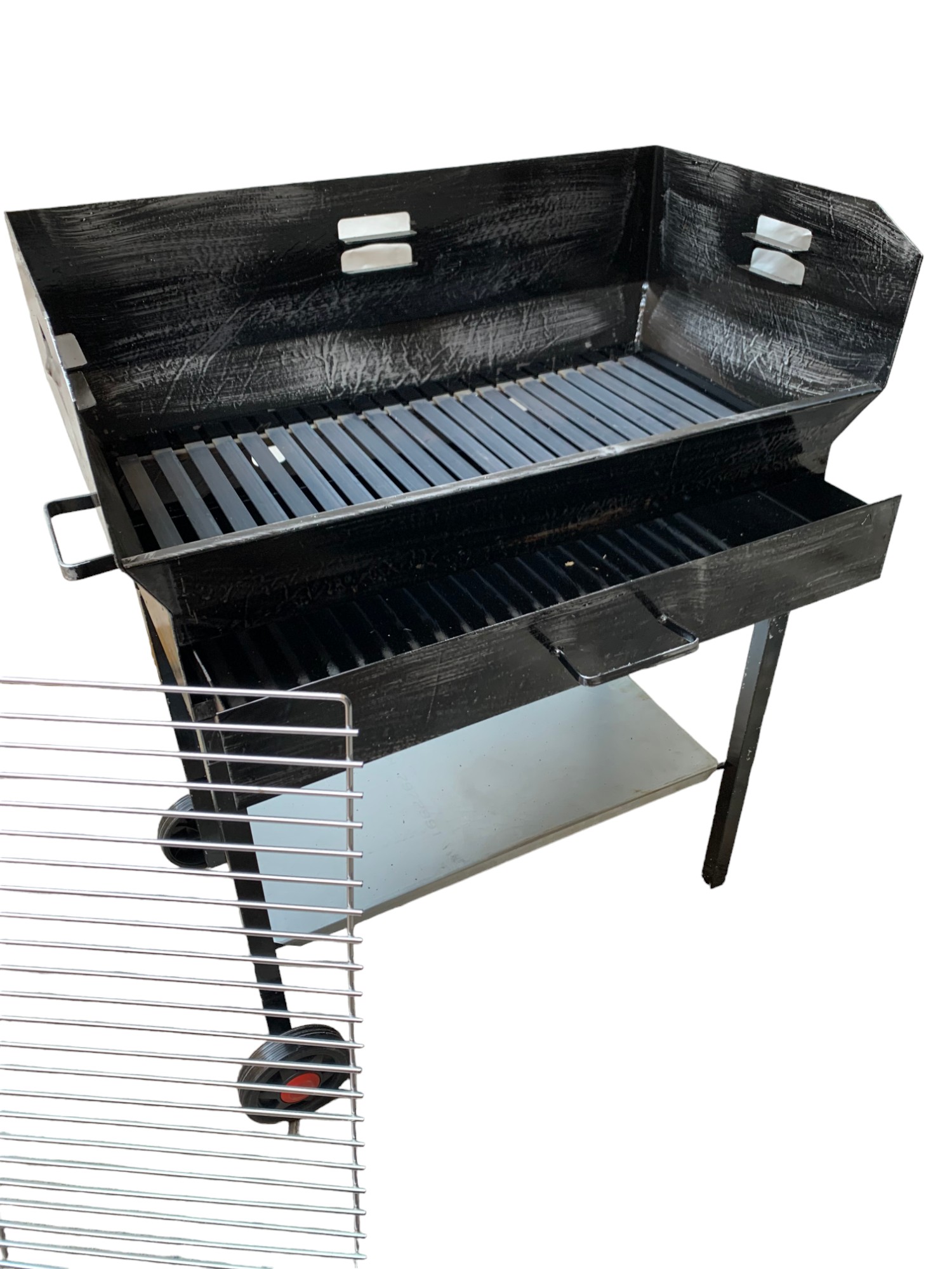 Un tradizionale barbecue a carbone o con legna con il braciere situato sotto la griglia di cottura, una graticola in tondino pesante di acciaio, con le sue 2 altezze di cottura regolabile.