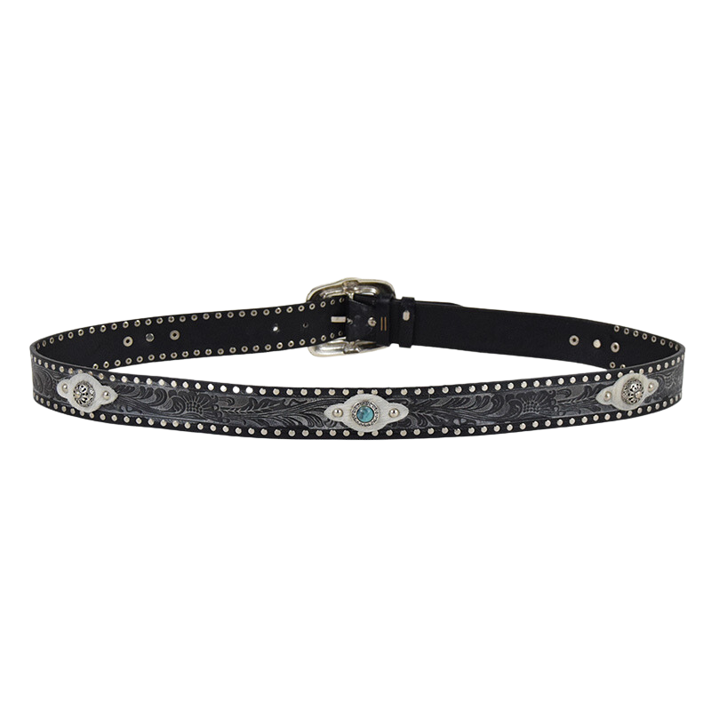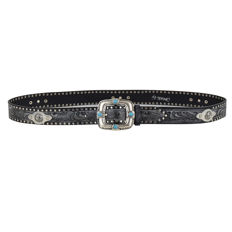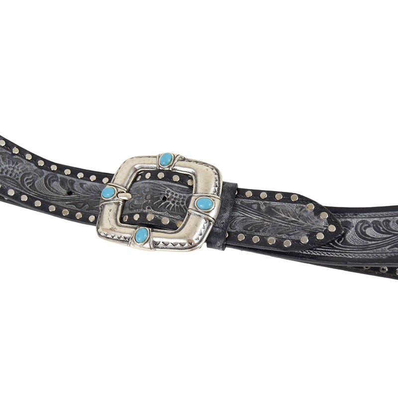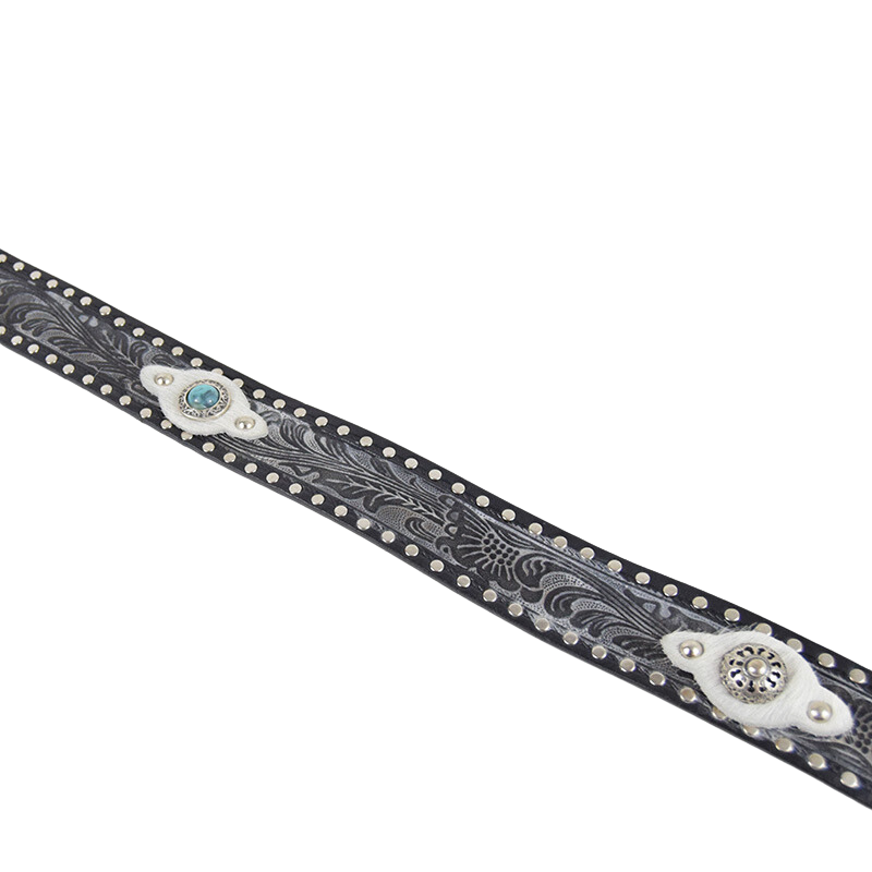 Altezza 4cm. Fibbia in zamak galvanica argento con simil pietre turchesi. Borchiata interamente a mano con rivetti color argento e dettagli in cavallino.