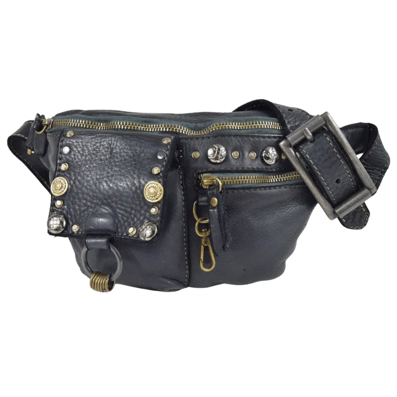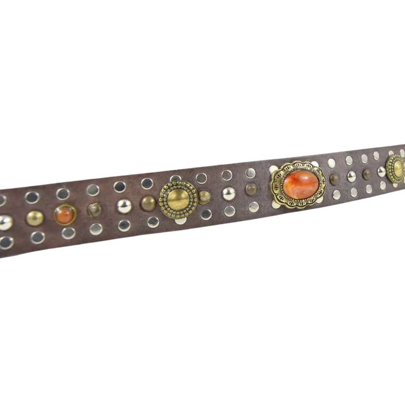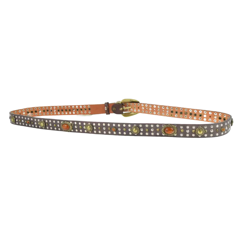 Altezza 2,5cm. Fibbia, passante e puntale in zamak galvanica ottone effetto invecchiato. Borchiata interamente a mano con rivetti color argento e ottone, e borchie con simil pietre ambra.