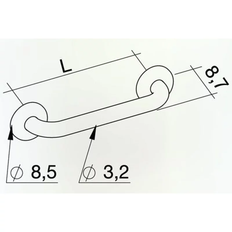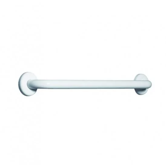 Il maniglione è completo di piastre di fissaggio in acciaio zincato e ghiere coprivite in acciaio inox laccato (non presenti viti e tasselli).